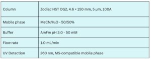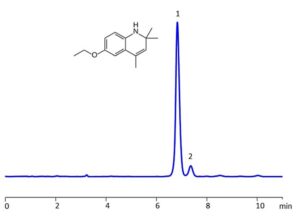 Ethoxyquin is a versatile antioxidant used in animal feed, agriculture, and rubber stabilization. It can be retained and analyzed on the Zodiac HST OG2 mixed-mode column using an isocratic mobile phase of water, acetonitrile (MeCN), and ammonium formate (AmFm) buffer. Detection is compatible with MS, ELSD, CAD, and UV at 260 nm.