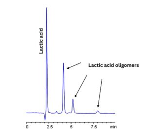 Lactic acid oligomers can be hydrolyzed back to monomeric lactic acid, allowing for comprehensive analysis of both the acid and its oligomeric forms. The Zodiac HST B2 column is suitable for analyzing lactic acid as a standalone compound or within complex mixtures.
