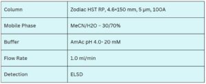 Lactic acid (also known as milk acid) is a hydrophilic organic acid that plays a key role in numerous bioprocesses. It has a natural tendency to self-associate, forming dimers, trimers, and higher molecular weight oligomers. Using the Zodiac HST RP mixed-mode HPLC column, lactic acid and its oligomers are effectively retained through a combination of weak reversed-phase and weak anion-exchange interactions. Retention is influenced by the proportion of acetonitrile, buffer concentration, and buffer pH. This method is fully compatible with LC/MS and other detection techniques, making it suitable for the analysis of lactic acid across a variety of sample matrices.