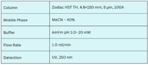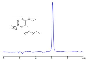The Zodiac HST TH column is employed to retain malathion and effectively separate it from impurities. With embedded ionic and hydrophobic groups, the column supports mixed-mode interactions, enabling precise and efficient separation of complex pesticide mixtures. The method is LC/MS compatible and offers a robust solution for the analysis of malathion and other organophosphate insecticides.