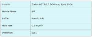 The Zodiac HST RP mixed-mode column offers effective retention and separation of these compounds, utilizing a combination of reversed-phase and ion-exchange mechanisms. This method is suitable for HPLC-based quantification of polysorbates in various complex matrices.