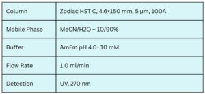The Zodiac HST C column efficiently separates pyridylacetic acid isomers (2-, 3-, and 4-pyridylacetic acids) using advanced reversed-phase and ion-exchange mechanisms. With a mobile phase of water, acetonitrile (MeCN), and a buffer, it ensures high resolution, peak symmetry, and compatibility with UV and mass spectrometry detection, making it ideal for pharmaceutical analysis.