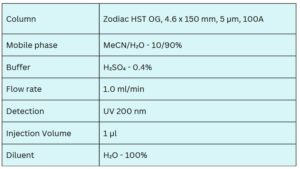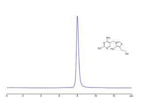 Thiamine can be effectively retained, separated, and analyzed using a Zodiac HST OG Column with a mixed-mode stationary phase. The analysis follows an isocratic method with a water, acetonitrile (MeCN), and sulfuric acid mobile phase. Detection is performed using UV at 250 nm for accurate results.