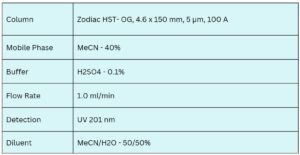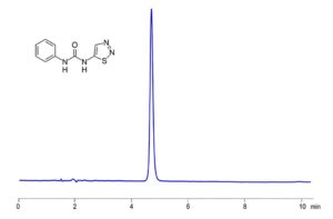 Thidiazuron (TDZ) is a phenylurea derivative that exhibits cytokinin-like activity, playing a significant role in plant tissue culture by promoting shoot regeneration and inducing cytokinin-like effects. It is widely used to enhance plant growth and development, particularly in tissue culture applications. Thidiazuron can be retained, separated, and analyzed using a ZODIAC HST OG mixed-mode stationary phase column. The analysis utilizes an isocratic method with a mobile phase comprising water, acetonitrile (MeCN), and sulfuric acid as a buffer. Detection is achieved using UV at 200 nm.