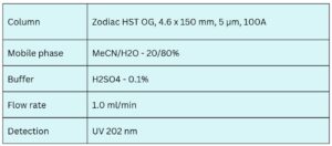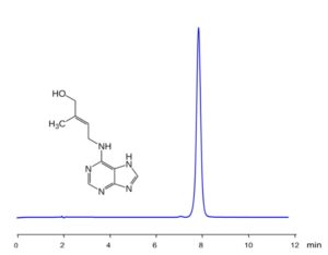 trans-Zeatin can be efficiently retained, separated, and analyzed using a Zodiac HST OG Column. The analysis follows an isocratic method with a water, acetonitrile (MeCN), and sulfuric acid mobile phase. Detection is performed using Vis at 200 nm for accurate results.