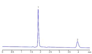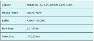 Trifluoroacetic acid (TFA) and acetic acid (AcOH) are widely used in organic synthesis and analytical chemistry. Their separation was achieved using the Zodiac HST N column, which utilizes a mixed-mode mechanism combining HILIC and anion-exchange interactions. This approach provides enhanced retention and improved peak shape for carboxylic acids. The addition of sulfuric acid to the mobile phase helps suppress the ionization of TFA, thereby boosting polar retention and optimizing chromatographic performance.