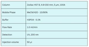 Acrylic acid can be effectively retained using the Zodiac HST B reverse-phase (RP) mixed-mode column in under 5 minutes. Zodiac HST B features embedded basic ion-pairing groups, enabling separation of both hydrophobic and ionic analytes within a single method.