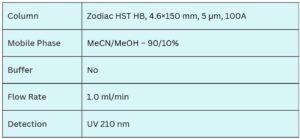 It can be effectively retained and analyzed using a Zodiac HST HB column, which employs hydrogen-bonding as the primary separation mechanism. The method uses an isocratic mobile phase of acetonitrile (ACN) and methanol (MeOH). Detection can be performed using low UV (210 nm) as well as ELSD, CAD, or LC/MS, offering versatile options for quantitation and identification.