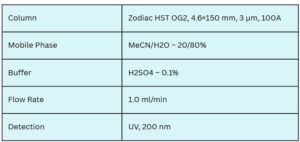 Atrolactic acid, a phenyl-substituted carboxylic acid, can be efficiently analyzed using the Zodiac HST OG2 mixed-mode column. This column offers excellent retention and separation of polar and acidic compounds. The analysis is performed under isocratic conditions with a mobile phase of 20% acetonitrile (MeCN) and 80% water, using 0.1% sulfuric acid (H₂SO₄) as the buffer. The flow rate is set at 1.0 mL/min, and detection is carried out using UV at 200 nm. The Zodiac HST OG2 column ensures high-resolution separation with sharp peak shapes under robust, MS-compatible conditions.