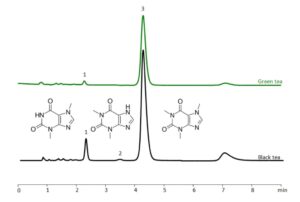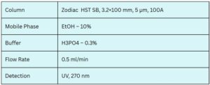 Caffeine, theophylline, and theobromine—three naturally occurring stimulants in tea—are effectively separated using the Zodiac HST SB mixed-mode column. The method provides clear resolution with a simple mobile phase and is suitable for UV detection.