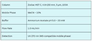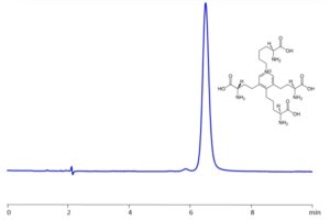 Desmosine can be detected at 270 nm using the Zodiac HST C mixed-mode reversed-phase cation-exchange column. The analysis is performed with a mobile phase consisting of acetonitrile (ACN) and water, with an ammonium acetate buffer to ensure precise separation and detection.