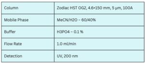 Fentanyl, a potent synthetic opioid used for pain management and anesthesia, can be effectively analyzed using the Zodiac HST OG2 mixed-mode column. The method utilizes an isocratic mobile phase composed of 60% acetonitrile (MeCN) and 40% water, buffered with 0.1% phosphoric acid (H₃PO₄). This setup ensures strong retention and excellent peak shape for this basic compound. The analysis is performed at a flow rate of 1.0 mL/min, with detection via UV at 200 nm. The Zodiac HST OG2 column provides reliable and reproducible results, making it well-suited for routine fentanyl quantification.
