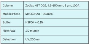 Pralidoxime chloride is a cholinesterase reactivator commonly used as an antidote for organophosphate poisoning. It can be effectively retained and analyzed using the Zodiac HST OG2 mixed-mode column, which provides excellent retention for polar and ionic compounds. The method employs a simple isocratic mobile phase of 20% acetonitrile (MeCN) and 80% water with 0.1% phosphoric acid (H₃PO₄) as the buffer. The separation is performed at a flow rate of 1.0 mL/min, and detection is carried out using UV at 200 nm. The Zodiac HST OG2 ensures sharp peak shapes and reproducible results under MS-compatible conditions.