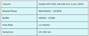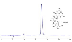 Streptomycin can be effectively retained and separated on the Zodiac HST OG2 mixed-mode column through a combination of hydrophobic interaction and ion-exchange mechanisms. The analysis is performed using an isocratic method with an MS-compatible mobile phase composed of acetonitrile (ACN), water, and sulfuric acid (H₂SO₄) as the buffer. Detection can be carried out using UV at 200 nm or mass spectrometry (MS).