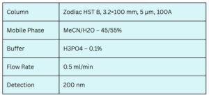 Thymol and Carvacrol can be effectively retained and analyzed using a Zodiac HST B mixed-mode column under a simple isocratic HPLC method. The mobile phase consists of acetonitrile (MeCN), water, and phosphoric acid as the buffer. Detection is performed using UV at 200 nm, offering high sensitivity and resolution.