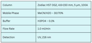 Tramadol, an opioid analgesic commonly used to treat moderate to severe pain, can be effectively analyzed in pharmaceutical tablet formulations using the Zodiac HST OG2 mixed-mode column. The method employs an isocratic mobile phase of 30% acetonitrile (MeCN) and 70% water, buffered with 0.1% phosphoric acid (H₃PO₄), ensuring optimal retention and resolution. Chromatographic separation is achieved at a flow rate of 1.0 mL/min, with UV detection at 216 nm. This method offers accurate and reproducible quantification of tramadol with excellent peak shape and selectivity.