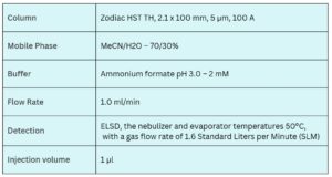Butyrylcholine can be effectively retained and analyzed using a Zodiac HST TH mixed-mode stationary phase column. The method utilizes an isocratic elution with a simple mobile phase composed of water, acetonitrile (MeCN), and ammonium formate as a buffering agent. Detection is performed using evaporative light scattering detection (ELSD).
