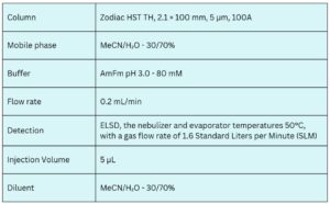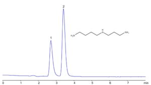 Spermidine can be effectively retained and analyzed using a Zodiac HST TH mixed-mode stationary phase column. The analysis utilizes an isocratic method with a straightforward mobile phase composed of water, acetonitrile (MeCN), and ammonium formate as a buffer. Detection is carried out using evaporative light scattering detection (ELSD).