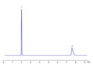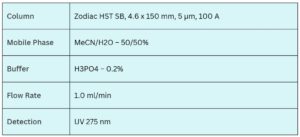 Ascorbic acid (Vitamin C) and sodium metabisulfite are important compounds with various uses. Sodium metabisulfite (S2O52−) is commonly used as a source of sulfur dioxide in wine production, as a bleaching agent in coconut cream production, and as a preservative in anesthetic solutions to prevent oxidation and extend shelf life. Ascorbic acid, found in citrus fruits and vegetables, is essential for maintaining the health of skin, bones, teeth, and blood vessels. These compounds can be separated, retained, and analyzed using a Zodiac HST SB mixed-mode stationary phase column with an isocratic method. The mobile phase consists of water, acetonitrile (MeCN), and phosphoric acid (H3PO4) as a buffer, with detection at UV 270 nm.