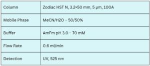 The Zodiac HST N column, engineered with highly polar characteristics and embedded acidic and basic ionizable functionalities, is capable of effectively retaining Sunset Yellow. The method is compatible with both LC/MS and UV detection, providing a versatile solution for the analysis of Sunset Yellow and structurally related polar dyes.
