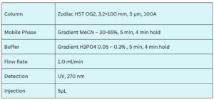 This method utilizes the Zodiac HST OG2 reverse-phase column, featuring embedded acidic ionizable groups, for the efficient separation and analysis of Lipitor (Atorvastatin). The method is suitable for routine analysis and quality control, offering sharp peak shapes and good retention.