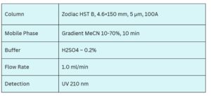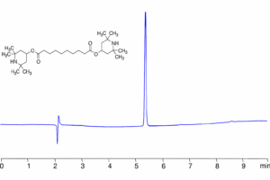Bis(2,2,6,6-tetramethyl-4-piperidyl) sebacate is a hindered amine light stabilizer (HALS) widely used in the production of plastics, as well as in pharmaceutical packaging and manufacturing applications. This compound can be effectively retained and analyzed using a Zodiac HST B mixed-mode reversed-phase column. The method employs a gradient elution with a mobile phase comprising acetonitrile (MeCN), water, and sulfuric acid as an ionic modifier. Detection is performed using UV at 210 nm, providing high resolution and excellent peak symmetry for reliable quantification.