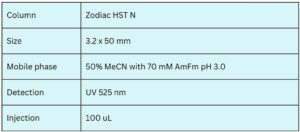 Zodiac HST N, a highly polar HPLC column with embedded acidic and basic ionizable functionalities, effectively retains and separates both Allura Red and Brilliant Blue. The method is fully compatible with LC/MS and UV detection and offers a robust solution for the analysis of structurally related polar dyes.