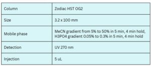 The Zodiac HST OG2 mixed-mode reversed-phase column, featuring embedded acidic ionizable groups, effectively retains Bupropion. This UV-compatible method serves as a general and robust approach for the analysis of Bupropion and related compounds.