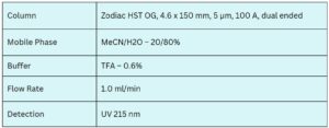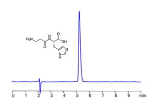 Carnosine is a naturally occurring dipeptide composed of beta-alanine and histidine, known for its pH-buffering and antioxidant properties in muscle tissue. It can be effectively retained and analyzed using the mixed-mode Zodiac HST OG column. The analysis is performed with a mobile phase comprising water, acetonitrile (MeCN), and trifluoroacetic acid (TFA). This method offers high-resolution separation with excellent peak symmetry and is suitable for UV detection at 215 nm.