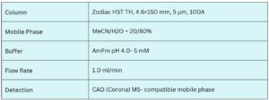 For HPLC analysis, choline can be effectively retained and separated using the Zodiac HST TH column. This column features embedded ion-pairing groups with both positive and negative charges in the stationary phase, enabling precise separation of analytes with diverse ionic characteristics. The method uses isocratic elution with a mass spectrometry-compatible mobile phase composed of acetonitrile (ACN), water, and ammonium formate (AmFm) buffer. Detection can be performed using ELSD, CAD, or LC/MS