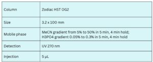 Rosuvastatin, the active ingredient in Crestor, is a statin used to manage cholesterol levels and prevent cardiovascular disease. The Zodiac HST OG2 reverse-phase column, with embedded acidic ionizable groups, is well-suited for the retention and sharp separation of Rosuvastatin under gradient conditions.