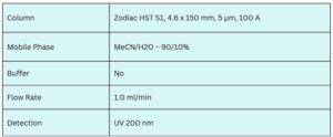 These three compounds—cyanamide, dicyandiamide, and urea—can be efficiently retained, separated, and analyzed using the Zodiac HST S1 normal-phase mixed-mode column. The analysis is performed with a mobile phase composed of water and acetonitrile (MeCN) without any buffer, and detection is carried out via UV at 200 nm.