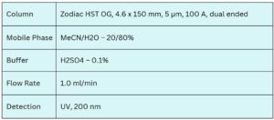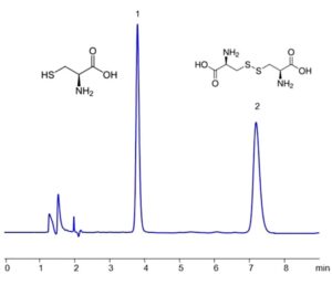 Cysteine is an amino acid that serves as a crucial component in numerous proteins throughout the body, while cystine—an oxidized dimer of cysteine—plays a key role in redox reactions and maintaining the structural integrity of proteins through disulfide linkages. Both cysteine and cystine can be effectively retained and separated using the Zodiac HST OG mixed-mode column. The analytical method employs a mobile phase composed of water, acetonitrile (MeCN), and sulfuric acid (H₂SO₄), enabling high-resolution separation with excellent peak symmetry. Detection is performed using UV at 200 nm.