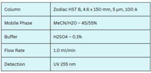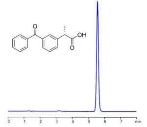 Dexketoprofen can be retained and analyzed using the Zodiac HST B mixed-mode reversed-phase column. The method utilizes an isocratic mobile phase consisting of water, acetonitrile (MeCN), and sulfuric acid. The compound is effectively detected using UV at 255 nm, providing excellent resolution and peak symmetry.