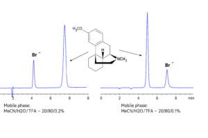 In a simple mobile phase composed of water, acetonitrile (MeCN/ACN), and trifluoroacetic acid (TFA) as the buffer, the elution order of dextromethorphan and bromide can be reversed simply by adjusting the buffer concentration. This flexible retention behavior is particularly useful for fine-tuning separations in method development.