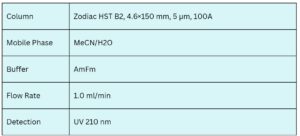 Dextromethorphan, a common active ingredient in over-the-counter cough suppressants, can be effectively analyzed using HPLC on the Zodiac HST B2 mixed-mode column. This column features reversed-phase retention along with embedded basic ion-pairing functionality, enabling precise control over analyte elution.