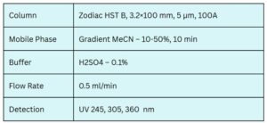 Drotaverine can be effectively retained and separated from related impurities using a Zodiac HST B mixed-mode reversed-phase column. The method utilizes a gradient mobile phase of water and acetonitrile (MeCN), with sulfuric acid (H₂SO₄) serving as the buffer. Detection is carried out at 360 nm in the high UV range, ensuring high sensitivity and reliable identification.