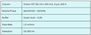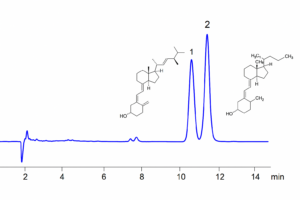 Vitamins D₂ and D₃ absorb in the high UV range and can be effectively separated using a Zodiac HST SB reverse-phase column. The method employs a mobile phase of water and acetonitrile, buffered with acetic acid, allowing for efficient retention and resolution. Detection is performed by UV at 265 nm.