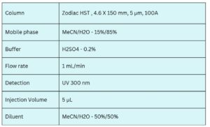 Evogliptin can be effectively retained and analyzed using the Zodiac HST B mixed-mode stationary phase column. The method involves a simple isocratic mobile phase composed of water, acetonitrile (MeCN), and sulfuric acid as a buffer. UV detection at 300 nm enables sensitive and reliable quantification, making the method suitable for routine pharmaceutical analysis.