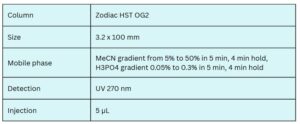 Hydrocortisone, also known as 11β,17α,21-trihydroxypregn-4-ene-3,20-dione, is a corticosteroid that mimics the natural hormone produced by the adrenal glands. It is commonly used to treat various forms of arthritis as well as skin conditions characterized by redness, swelling, and itching. The Zodiac HST OG2 mixed-mode reversed-phase column, featuring embedded acidic ionizable groups, effectively retains Hydrocortisone. This UV-compatible method offers a reliable and general approach for the analysis of Hydrocortisone and related corticosteroid compounds.