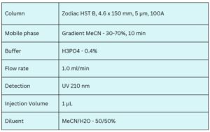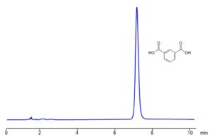 Isophthalic acid can be effectively retained, separated, and analyzed using the Zodiac HST B mixed-mode stationary phase column. The method utilizes a gradient elution with a simple mobile phase consisting of water, acetonitrile (MeCN), and phosphoric acid as a buffer. Detection is performed using UV at 210 nm, making this approach both efficient and versatile for the analysis of aromatic acids.