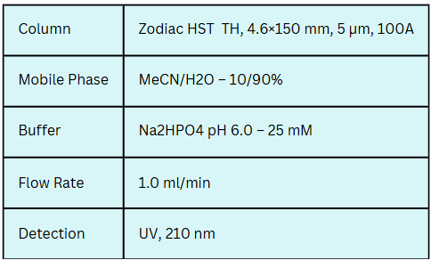 L-Lysine, an essential amino acid, supports growth, tissue repair, and helps alleviate anxiety. It is commonly found in red meats, beans, fish, and dairy products. L-Arginine, another essential amino acid, is used to treat congestive heart failure, fatigue, and circulatory diseases while also boosting the immune system. These compounds can be retained and separated on the Zodiac HST TH reverse-phase column, which features embedded ionic groups. The method is UV-compatible and serves as a general approach for analyzing similar compounds.