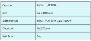 Lidocaine, also known as xylocaine or lignocaine, is a local anesthetic and antiarrhythmic agent. It works by blocking nerve signals in the body, effectively numbing tissue in a targeted area. Lidocaine is commonly used to relieve pain from skin irritations, but an overdose can lead to serious and potentially fatal side effects. The Zodiac HST OG2 mixed-mode reversed-phase column, featuring embedded acidic ionizable groups, provides effective retention of Lidocaine. This UV-compatible method serves as a robust and general analytical approach for Lidocaine and other structurally similar compounds.