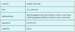 Ondansetron is a competitive serotonin type 3 (5-HT3) receptor antagonist used to prevent nausea and vomiting associated with chemotherapy. It works by blocking serotonin receptors and reducing vagus nerve activity. Common side effects include headache, constipation, and dizziness. The Zodiac HST OG2, a reverse-phase column with embedded acidic ionizable groups, effectively retains Ondansetron. This UV-compatible method provides a reliable and versatile approach for analyzing similar compounds.