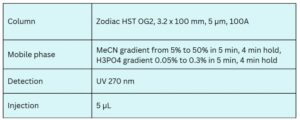 Pindolol, a non-selective beta-adrenergic receptor blocker with intrinsic sympathomimetic activity, was analyzed using the Zodiac HST OG2 mixed-mode reversed-phase column. This column features embedded acidic ionizable groups, offering enhanced selectivity and retention for basic pharmaceutical compounds like Pindolol.