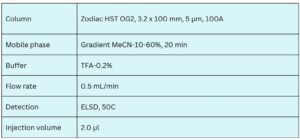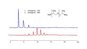 Poly(propylene glycol) bis(2-aminopropyl ether) is a diamine-terminated polyether used in polymer synthesis and epoxy curing. It can be effectively retained and analyzed using the Zodiac HST OG2 mixed-mode column under gradient conditions with acetonitrile, water, and trifluoroacetic acid (TFA) as the mobile phase. Detection is performed using ELSD at 50°C, ensuring reliable separation of polymer variants based on molecular weight distribution.