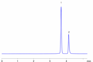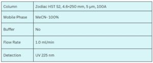 Succinic acid, an important intermediate in the electron transport chain, and its derivative, succinic anhydride, used in polymer resins and various industrial applications, can be effectively separated using the Zodiac HST S2 column. This HILIC-based column utilizes hydrogen-bonding interactions for retention. A mobile phase consisting of water and an acetonitrile (ACN) gradient—without buffer—enables clean separation and good retention of both compounds. The method supports UV detection at 225 nm and is suitable for applications in pharmaceuticals, food, and fragrance industries.