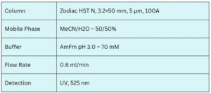 The Zodiac HST N column, designed with highly polar properties and embedded acidic and basic ionizable functionalities, offers effective retention of Sunset Yellow. The developed method is suitable for both LC/MS and UV detection, making it a reliable platform for the analysis of Sunset Yellow and other structurally related polar azo dyes.