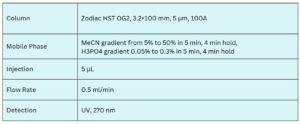 The Zodiac HST OG2 column (3.2 × 100 mm, 5 µm, 100 Å), with its mixed-mode selectivity, enables efficient resolution of both compounds: