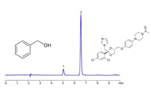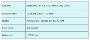 Ketoconazole can be effectively retained and analyzed using a Zodiac HST B reverse-phase column. The analysis is performed using a gradient method with a mobile phase consisting of acetonitrile (MeCN), water, and Ammonium Formate as the ionic modifier. Detection is carried out using UV at 250 nm, delivering high resolution and excellent peak symmetry.